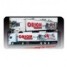 You must have it! Daily you see our truck at the road - now it drives up at your home... Original `Mercedes Actros` in benchmark 1.87 with "ORION" imprint. White/black/red, driving cab made of metal, truck type gear and trailer made of plastic.